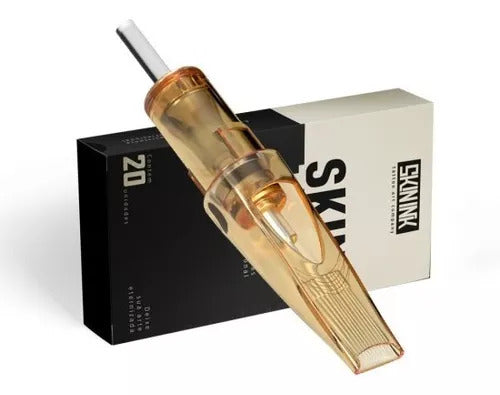 Cartuchos para tatuagem, as agulhas Fine Line Skin Ink possuem encaixe universal, foi desenvolvida para melhorar o fluxo de tinta em traços finos, o formato anatômico do bico permite que a agulha se movimente sem trepidação. A estrutura do cartucho possui duas conchas de retenção, o pigmento é armazenado em seu interior fazendo com que as agulhas carreguem o pigmento sempre que acionada. O corpo do Cartucho Fine Line Skin Ink é fabricado em policarbonato, a resistência deste material permite que o cartucho não vibre mesmo quando a máquina é acionada em voltagens mais altas, a membrana possui resistência e flexibilidade para o movimento preciso da barra que sustenta as agulhas.